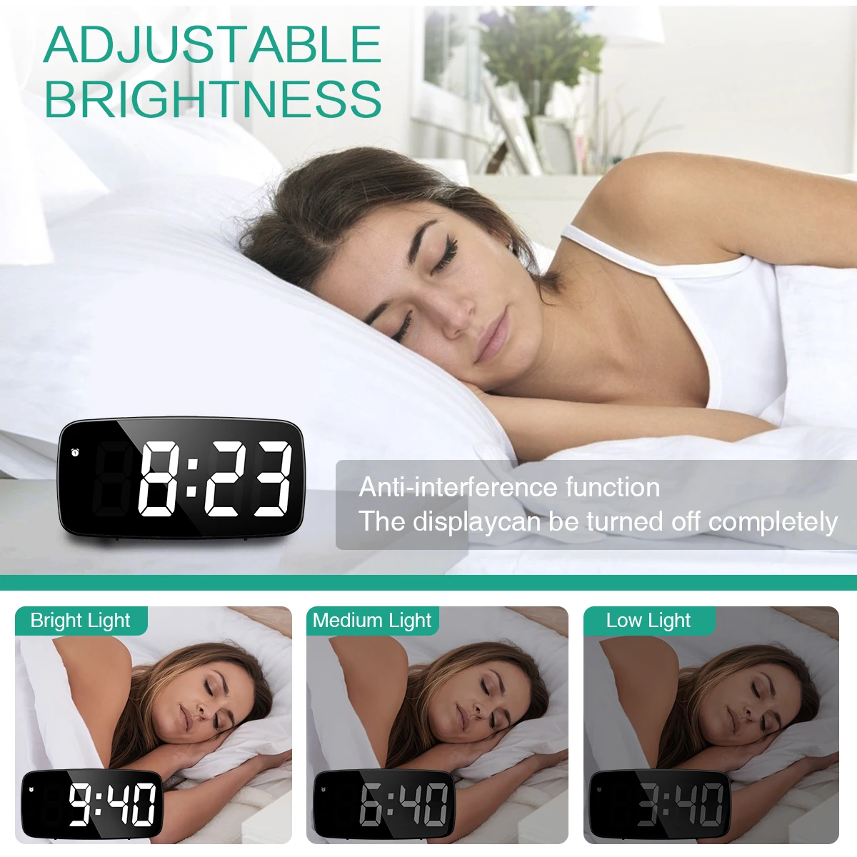3 Adjustable brightness & Automatic Adjustment: LED alarm clock has 3 levels of adjustable brightness. In addition, you can set automatic brightness adjustment, and the screen will automatically dim between 18:00 pm and 6:00 am.